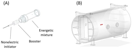 The energetic train (A) and the detonation chamber (B) used for the synthesis of oxide ceramics. The red cylinder in the detonation chamber represents the energetic train.