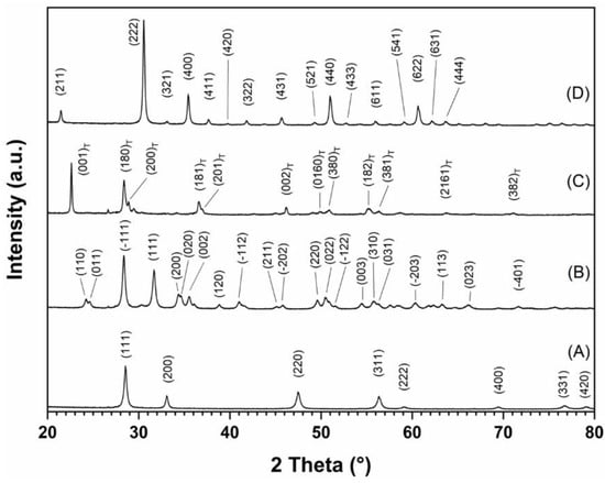XRD patterns of the as-detonated oxide ceramics: (A) CeO2 (JCPDS card No. 01-081-0792), (B) HfO2 (JCPDS card No. 00-034-0104), (C) Nb2O5 (JCPDS cards No. 00-30-0873), and (D) In2O3 (JCPDS card No. 00-006-0416), respectively.