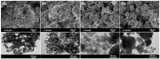 SEM (top) and TEM (down) images of the as-detonated (A) CeO2, (B) HfO2, (C) Nb2O5, and (D) In2O3 oxide ceramics, respectively.