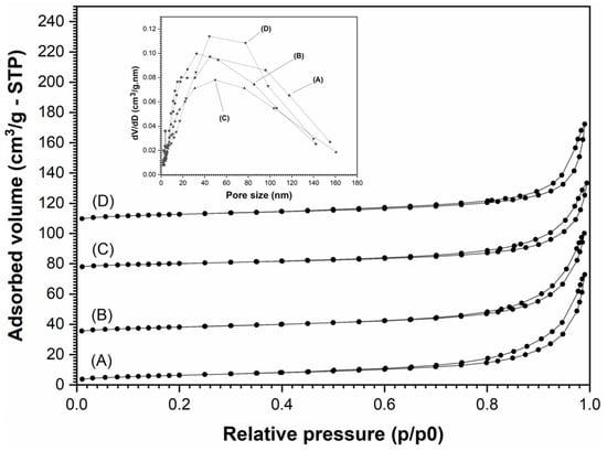Nitrogen physisorption measurements were performed on the different oxide ceramics synthesized by detonation. The representative isotherms are displayed in Figure 4. According to the IUPAC standard, the four curves exhibit type-IV profiles with H3 hysteresis loops [].