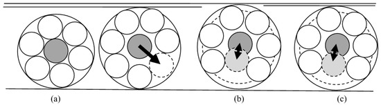 Geometrical approach to shifting possibilities. In case (a) of Figure 2, all spheres first swing radially at the same time and then crowd together along the boundary. This scenario seems extremely unlikely, if not impossible. Scenario (b) seems to be more realistic and raises the question as to what minimum distance the limit must be in order for at a certain moment a gap to open and the middle sphere to move out of its position. Presumably the situation (c), as an intermediate between (a,b), comes closest to the truth.