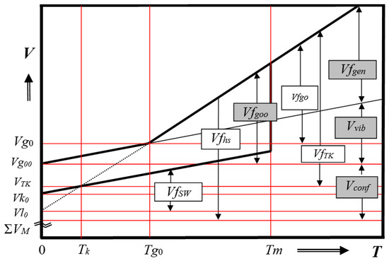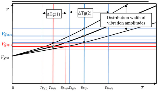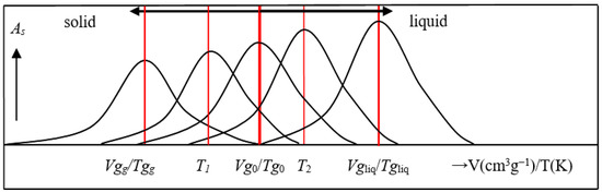 The vibrations of the vibrating elements are undoubtedly distributed around a mean value corresponding to the respective temperature. The width of the vibration amplitudes is limited and corresponds to a defined range of specific volumes Vi. Vg0 represents the specific volume below which the apertures between molecules are smaller than the smallest molecular axis cross-sections. If, when approaching Vg0, the lowest Vi values within a distribution are smaller than Vg0, the result is a state in which both liquid and glassy solid matter is present. This condition is basically present in the glass transition interval between Tgg and Tgliq. The relations in the transition interval are depicted in Figure 7.