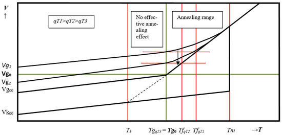 The usual methods of measuring the glass (transition, transformation) temperature, dilatometric or calorimetric measurements with a constant rate of change in temperature qT = ±dT/dt, do not give the molecular elements sufficient time to preserve the equilibrium density when the temperature falls below a certain value dependent on qT. The temperature range in which this time dependence is clearly perceivable is defined as the transformation or glass transition range, with the deviation from equilibrium density described as “beginning freezing”. It has to be pointed out, however, that the width of the “transformation range” is variable depending on qT and can be moved on the temperature axis. This is also true for the hysteresis range used for definition purposes by Mazurin and Rekhson [82]. Theoretically, there is no upper limit since the thermodynamic equilibrium is fundamentally disturbed when the rate of temperature alteration is higher than the respective relaxation time τ of the inner structure. The fictive temperature Tf, i.e., the temperature that the system would have in equilibrium with the current density, deviates increasingly from the current temperature the faster the cooling rate or the higher the relaxation time of the inner structure respectively the higher the viscosity is. In the presented model concept, the volume deviation from the equilibrium density is not interpreted as a beginning freezing. As long as the actual temperature remains above the true glass temperature Tg0 during the cooling processthe system tries to achieve the equilibrium density and will finally reach this after sufficient waiting time (annealing). Therefore, the “glass transformation”, in that inadequate sense, is not a special property of supercooled liquids but in general a property of any liquid which is being cooled from any high temperature. In a nutshell, starting at a very high temperature with a fast cooling rate the fictive temperature Tf, and thus density, may deviate from the equilibrium density even above Tm. In this case, a stable glass with a large free volume below Tg0 should be present, which does not react to annealing with respect to its viscous behavior. Figure 5 shows the time-dependent development of the specific volume at constant cooling rate.
