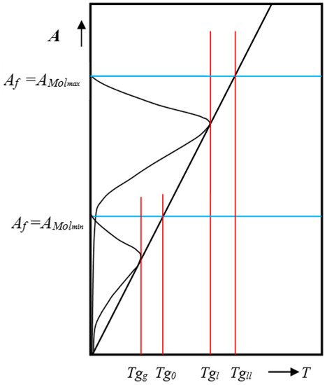 Limitations of viscosity regimes (schematic). The ordinate of Figure 6 exhibits the size of the cross-sectional area of the temperature-dependent gaps Af. The blue lines represent the cross-sectional area of the smallest and larges molecular axes. The curved lines symbolize the distribution width of gaps for one distinct temperature characterized by the maximum of curves. For T < Tgg all gaps are smaller than AMolmin, the cross-sectional area of the smallest molecular part, thus translational movement is no longer possible. Below Tgg there is only the solid glass. Above Tgll the pure liquid state is reached. The upper limit Tgliq of the smallest molecular axes was not drawn for reasons of clarity.