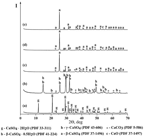 It is known by literature data that further heating of hemihydrate calcium sulfate leads to a complete loss of water with the formation of polymorphic forms, firstly water-soluble γ-anhydrite calcium sulfate γ-CaSO4, and then insoluble β-anhydrite calcium sulfate β-CaSO4, which was confirmed by XRD data (Figure 1b,c).
