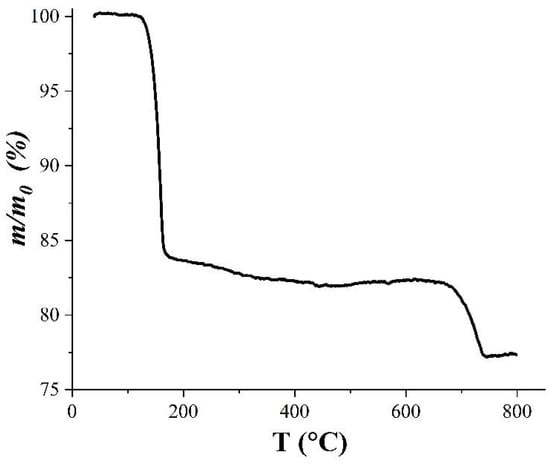 The TA data (Figure 2) revealed that the total mass loss of the synthesized powder heating up to 800 °C was 23% and proceeded in two stages, which correspond to the intervals of 100–180 °C and 640–750 °C.