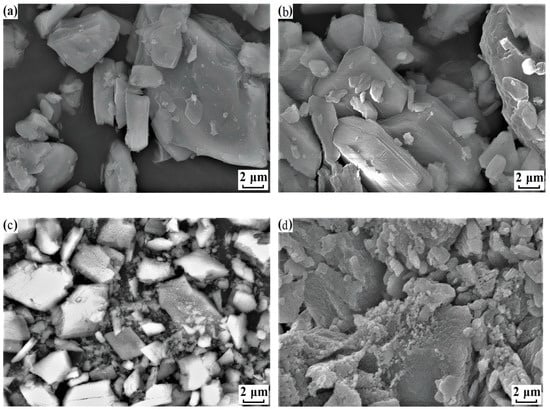The synthesized and dried 40 °C calcium sulfate powder (Figure 3a) is presented in the form of irregular agglomerates with a size of 1–10 μm. It is known that the form of calcium sulfate particles is acicular crystals. The by-product of the reaction probably present in the powder in a small amount leads to the sticking-together of the powder particles and determines the multilevel structure of the aggregates. After heat treatment at 350 °C (Figure 3b), the microstructure of the calcined powder inherits the synthesized microstructure. After heat treatment at 600 °C (Figure 3c), the calcium sulfate powder consists of irregular agglomerates with a particle size distribution of 1 to 6 µm that consist of smaller aggregates 0.5–1 µm in size, which are respectively composed of rhombohedral particles 100–250 nm in size. After heat treatment at 800 °C (Figure 3d), the sintering of calcium sulfate powder is observed. The size of the grains is 100–200 nm that formed agglomerates with irregular forms.