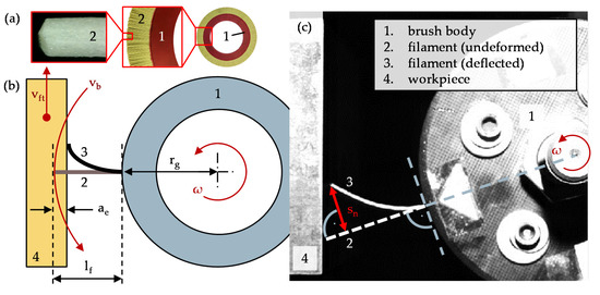 Brushing with bonded abrasives is an industrial manufacturing process, which is predominantly used for the deburring and rounding of metallic workpiece edges. Furthermore, it has gained importance in the finishing of technical surfaces, mainly for the reduction of the surface roughness [1,2,3]. The process is characterized by its flexible brushing tools (Figure 1), usually consisting of a cast epoxy brush body, to which abrasive filaments are attached (Figure 1a). These are composed of an extruded polymer matrix, normally polyamide 6.12, and bonded abrasive grains, normally silicon carbide (SiC) or aluminum(III) oxide (Al2O3). However, especially during the finishing of ceramic workpieces, hard abrasives, such as diamond or cubic boron nitride (cBN), are required [1,4].