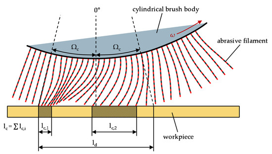 The results indicate that the calculated process forces do not vary significantly for segment numbers of n ≥ 25, so that n = 25 was chosen as a compromise between high accuracy and low computation time. By the introduction of a rotating brush body and a translationally moved workpiece in the form of boundary conditions, the contact between abrasive filaments and arbitrary workpieces can be simulated in three-dimensional space. To subsequently characterize the contact behavior, a nominal contact length ld was defined, which can be deduced from the contact angle Ωc (Figure 2). Depending on the tool specification and process parameters, abrasive filaments may exhibit dynamic oscillatory behavior following the initial workpiece contact, which leads to the bouncing of the filament tips on the workpiece surface. Therefore, the actual contact length lc was calculated as the overall sum of the single contact lengths lc,i.