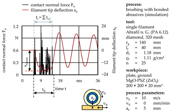 With regard to the dynamic oscillatory behavior of the abrasive filaments, the contact time ratio εtc is most likely a more robust measure than the previously established maximum filament tip deflection sn,max, meaning the maximum absolute value of the shortest distance between deflected filament tip and undeformed filament during the filament-workpiece contact [13] (Figure 1c). Its main disadvantage becomes apparent while studying the curve shape of the filament tip deflection sn over time t (Figure 3), which may fluctuate considerably during the workpiece contact, where the deflection maximum is located. However, the maximum filament tip deflection sn,max lacks usable information about the workpiece contact itself, which would be crucial in order to understand the effects of highly dynamic filament behavior on the productivity.