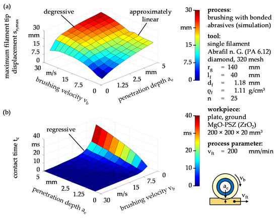 The maximum filament tip displacement sn,max, used to monitor dynamic oscillatory filament behavior during previous research [14], increases approximately linearly with the brushing velocity vb and degressively with the penetration depth ae (Figure 4a) but otherwise provides insufficient information about the filament–workpiece contact due to the absence of a time dependent component. The corresponding contact time tc shows a highly regressive decrease with increased brushing velocity vb (Figure 4b), although this effect is more prevalent for large penetration depths ae than for small penetration depths ae because of the increased contact angle Ωc (Figure 2). This implies that the brushing velocity vb has a considerably greater impact on the contact time tc, as well as on subsequently calculated parameters, than the penetration depth ae.