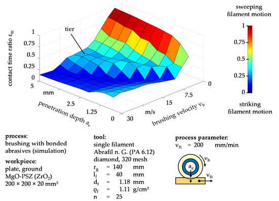 For a more suitable visualization, the contact time tc was divided by the nominal contact time td to calculate the contact time ratio εtc (Equation (2), Figure 5). Variation of the process parameters shows that high brushing velocities vb lead to primarily striking filament motions (εtc → 0) because abrasive filaments, deflected by an initial workpiece contact, are moved past the contact zone before they can swing back. In addition, an approximately proportional separating line between brushing velocity vb and penetration depth ae can be observed, below which filament motions are primarily striking, and above which the primarily sweeping region is characterized by a distinguishable tier.
