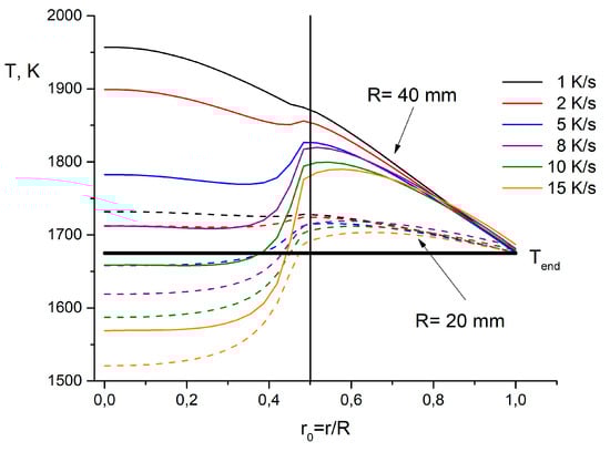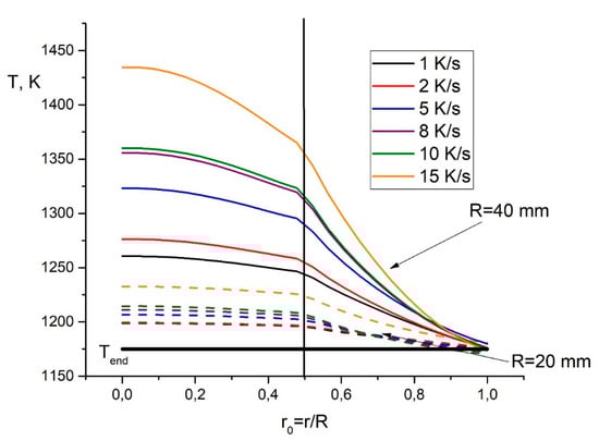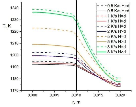 Figure 5 shows the radial temperature profiles versus dimensionless radius. The radial temperature distribution in the sample is considered for the moment when the temperature on the outer surface of the graphite die reaches 1175 K, i.e., the temperature to which heating is carried out. It can be seen that for all heating rates, the temperature of copper is higher than the temperature of the outer surface of graphite. Starting at a heating rate of 8 K/s and higher, the temperature in the sample with a radius of 20 mm is about 250 K higher than the temperature measured on the graphite surface. This difference in temperature inside the sample and at the periphery of graphite is due to the fact that copper has better thermal and electrical conductivity than graphite.