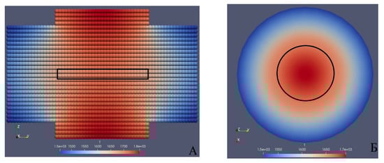 The computational domain consists of punches (graphite), a die (graphite), and a sample. First, the geometry of the computational domain, the initial temperature T0, and the type of material are specified. The initial fixed approximation of the electric potential is considered to be uniformly distributed from the value of U at the top of the punch to a fixed value of 0 at the bottom of the punch. The initial voltage U is determined based on the heating rate (linear gradient in the direction of the axis).