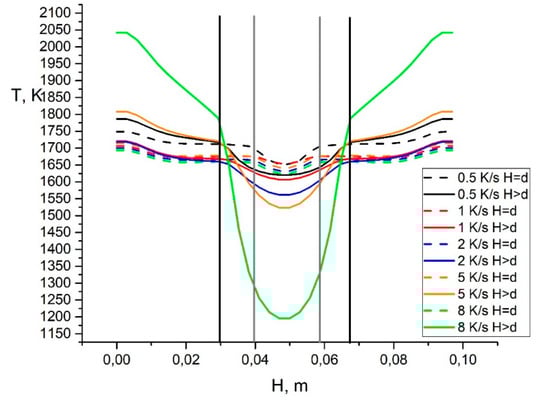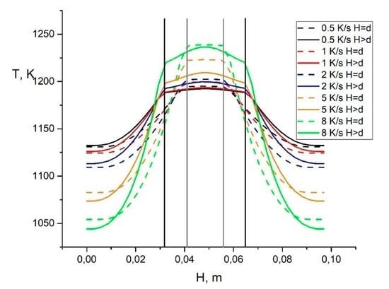 Figure 10 shows the results of calculating the change in the temperature of an alumina sample along the Z axis. At high heating rates in a sample with H = 4r, there is a strong “dip”—a decrease in temperature in the central part, which is clearly visible at a heating rate of 8 K/s. The central part of all samples in