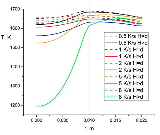 Figure 7 that all temperature distribution curves for samples with a height greater than the diameter are below the temperature distribution curves for samples with a height equal to the diameter. This is natural since samples of greater heights are more difficult to heat. A significant difference between the temperature distribution curves of the samples is observed for a heating rate of 5 K/s. The radial temperature distribution curve at a heating rate of 1 K/s for a sample with a height equal to its diameter coincides with the similar curve at a heating rate of 2 K/s for a sample with a height greater than its diameter. For all curves, the temperature in the central part of the sample is higher than the temperature at the periphery, where there is contact with the graphite die. As in the case of thin disk samples, the following trend is observed: the higher the heating rate, the higher the temperature difference at the center and at the periphery of the sample.