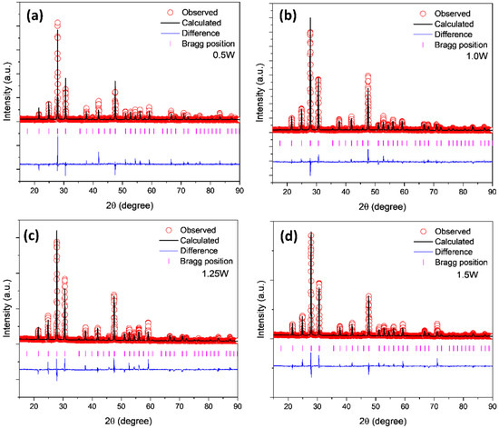 Rietveld refinement patterns for different W-doped samples at room temperature; (a) 0.50 W; (b) 1.0 W; (c) 1.25 W; (d) 1.5 W.