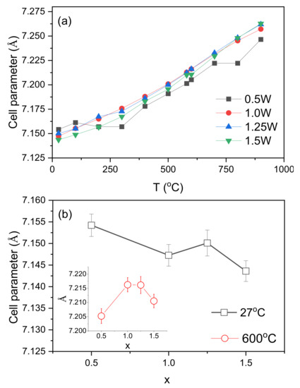Figure 2a shows the unit cell parameter evolution upon heating, as obtained from the refinements. The composition dependence of the cell parameter in Figure 2b shows a non-linear variation, in agreement with previous studies [20]. One possible reason is the decrement in the coordination numbers of W upon substitution, as well as the non-linear evolution of [O1La3(Mo,W)] antitetrahedral units [20,21]. Here O1 is an oxygen lattice site.