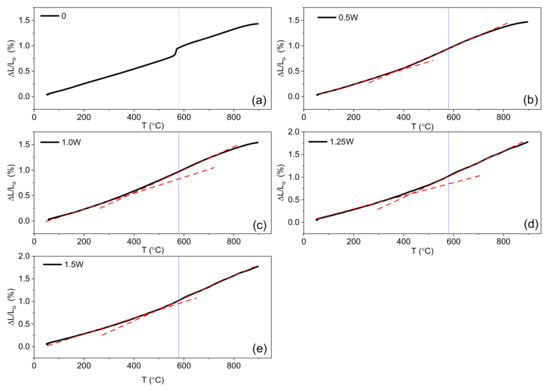 Variation of thermal expansion for different samples; (a) undoped La2Mo2O9, (b) 0.50 W; (c) 1.0 W; (d) 1.25 W; (e) 1.5 W. The vertical lines at 580 °C represent the phase transition of undoped La2Mo2O9. The dashed lines indicate the linear regimes.