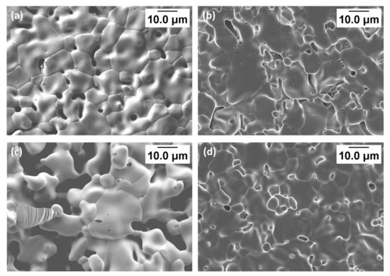 The reciprocal temperature dependence of the individual resistances obtained from grain and grain boundaries indicates their semiconducting property, as shown in Figure 8 and Figure S9. To get an estimation of the activation energy (), the data have been modeled using the Nernst–Einstein equation [46].