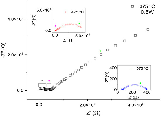 Nyquist plot at different temperatures for 0.5 W sample. *: bulk; *: grain boundary and *: electrode effect.