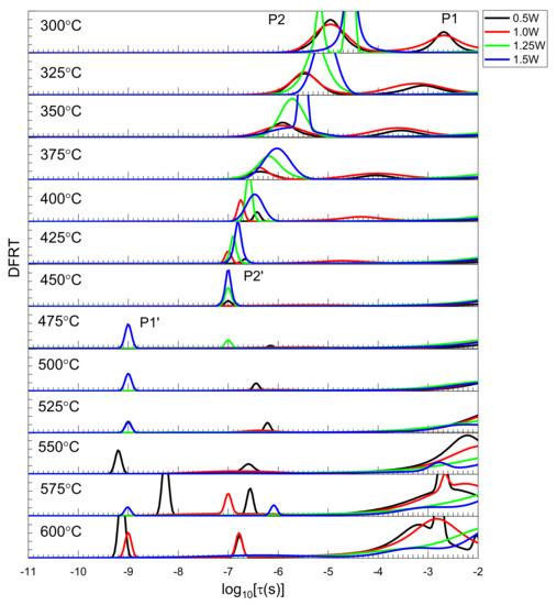 It can be seen that the grain-size distribution is not uniform (Figure S4) for 1.25 W and 1.5 W, and the neck region can be observed between bigger grains (Figure 4c,d). The special arrangement of grains suppresses the grain contribution, as compared to grain boundaries. This explains why the grain contribution is not observed in the DFRTs for 1.25 W and 1.5 W (Figure 6). Secondly, the grain-boundary diffusion predominates, as the activation energies decrease abruptly (Table 3). LAMOX members show an activation energy of ~1.2 eV (see Table 3 and [28,44]). Low-activation energy (0.37 eV) is reported for La1.9Y0.1Mo2O9 in a reduced atmosphere, exhibiting electronic transport [45]. Here, the low-activation energy corresponds to the electronic contribution of the grain boundary. Nevertheless, the electronic contribution of grain boundaries is also reported when using DFRTs in La2Mo2−xTaxO9 (0.02 ≤ x ≤ 0.10) [37] and Ce0.90Gd0.10O1.95 [38] oxide ion conductors. More specifically, electronic transport refers to electron conduction, unlike ionic conduction in oxide ion conductors, whereas the electronic contribution in grain boundaries refers to the space charge layer effect for oxide ion conductors [38].