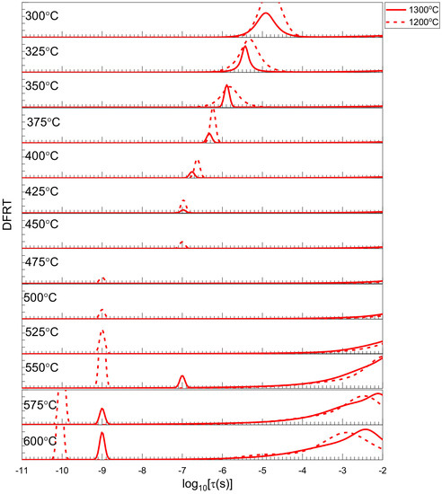 To find the effect of thermal treatment on ionic conductivity, we carried out additional impedance measurements on a 1.0 W sample, heated again at 1300 °C and 1200 °C, separately, for 6 h after sintering at 1100 °C. As can be seen in Figure 7, the DFRTs show a similar feature as that found in Figure 6. No shift in peak position justifies that the effects of grain, grain boundaries, and ohmic drop are independent of external factors (such as heat treatments) and depend only on the crystal structure.