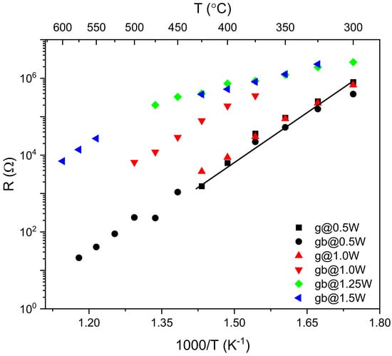 where is the transition temperature of ion mobility, is the pseudo-activation energy, is the Boltzmann constant and is the pre-exponential factor. In the VTF process, a vibration in the local environment of a mobile ion is observed, which is high enough to move the ion above the temperature [28]. At present, we have detected such anomaly using DFRTs as seen in Figure 6 around 450 °C. Thus, a change in ionic motion is detectable using DFRTs. More specifically, the DFRTs contain peaks that are localized on particular time-constants () where eff eff, and each electrochemical phenomenon can be identified by the ’s. Thus, a shift in peak position is caused by the external factor (here, temperature). Since the Arrhenius to Vogel–Tammann–Fulcher transition is a thermally activated process, such a transition is identified by the peak shifts, as described above. Although the high-temperature XRD suggests there is no structural phase transition, the ion transport studies indicate a transition around 450 °C, which is further evident by the reciprocal temperature dependence plot of resistances and conductivities (Figure 8 and Figure S9). Specifically, the Arrhenius to VTF transitions are observed for 0.5 W and 1.0 W from 425 °C, considering the grain-related peak, for 1.25 W from 475 °C, considering the grain boundary-related peak, and for 1.5 W from 425 °C, considering the grain boundary-related peak.