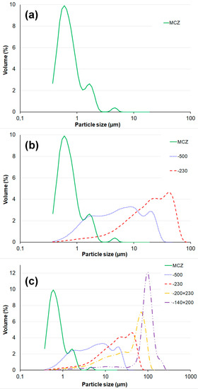 The particle size distribution (PSD) of the powder mixtures is presented in Figure 1. PSD of the fine particle matrix (Figure 1a), composite CZM, has a more frequent size of ~0.6 µm and 90% of its particles are smaller than 1.7 µm.