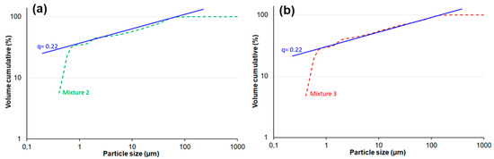 Graphical illustration of the PSD optimization according Andreasen coefficient of 0.22. (a) Composition of the CZM-2A (mixture 2); (b) Composition of the CZM-4A (mixture 3).