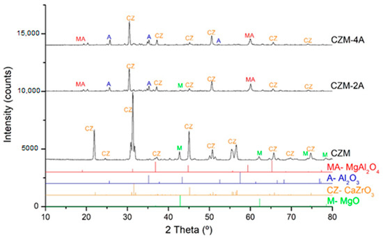 XRD analysis of the three composites: CZM, CZM-2A, and CZM-4A. Theoretical diffractograms of pure phases of CaZrO3 (XRD file/card #035-0790), MgO (XRD file/card #071-1176), Al2O3 (XRD file/card #46-1212), and MgAl2O4 (XRD file/card #77-1193) were represented. The main peaks identified were: CZ (CaZrO3), M (MgO), A (Al2O3), and MA (MgAl2O4).