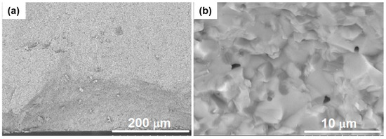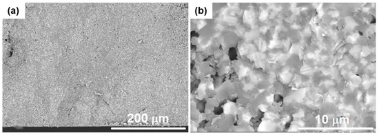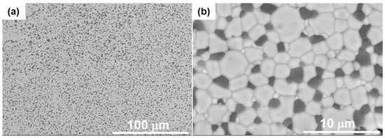 Microstructures were analyzed on polished and thermally etched surfaces by scanning electron microscopy (SEM, Hitachi S-3400N, Chiyoda, Tokyo, Japan) applying an accelerating voltage of 20 kV. Chemical analysis was performed using the SEM with energy dispersive X-ray probe (EDX, Brucker Quantax 400, Billerica, MA, USA). Thermal etching was carried out at 1350 °C, dwell of 30 min, with 10 °C/min heating and cooling rates. The etched surfaces, and the fracture surfaces as obtained, were coated with a thin gold layer using a turbomolecular pumped coater (Quorum Technologies, Q150T Plus, Lewes, UK).
