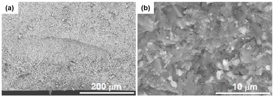 Representative SEM micrographs of the three sintered composites are shown in Figure 4, Figure 5 and Figure 6. An image with low magnification (×500) was used to obtain an overall view of the material and an image with high magnification (×5000) was used to enable the analysis in detail of the phases and their grain boundaries. From low magnification (Figure 4a, Figure 5a and Figure 6a), homogeneous materials were observed, with an equal distribution of the reinforcement and porosity phases, which demonstrates the goodness of the manufacturing conditions.