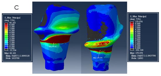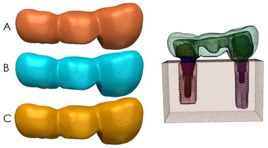 Many studies [11,12,24,25,27,28,29,30,38,39,42,45,46,47,48,49,50,51] have investigated an array of factors that could impact the survival rates and success of all-ceramic prostheses, including the radius of curvature of the gingival embrasure. Material properties of different ceramics [2,3,17], connector height and width [24,27,38,45,47], framework/veneer ratio [30], loading conditions [42], and patient factors [52] have been associated with a change in the lifetime of the restorations. Another factor to be considered is the crown/implant (C/I) ratio and its impact on the failure of implant components and cervical bone loss [51] under fatigue and various loads [53,54]. In this study, the peak stresses in models A, B, and C were observed at the superiobuccal portion of the mesial implant, which is longer and narrower than the posterior implant and has a higher crown/implant ratio. A recent FE study [55] showed that, with an increasing C/I ratio, the stress distribution in bone and implant increases. Such results are in agreement with the results of our study. However, in a systematic review [56], contradictory results were found: the highest C/I ratios presented less peri-implant marginal bone loss. Another systematic study [57] concluded that the increase in the C/I ratio does not seem to have a direct relationship with the increase in marginal bone loss and prosthetic failure. More research should be conducted regarding this topic as the results are not confluent and many factors can influence the outcomes.