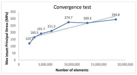 Seven mesh densities were used in an assembled model to conduct the convergence test. The INP files of the different mesh densities were imported and analyzed subsequently by a finite element analysis software (ABAQUS; Dassault Systèmes, Johnston, RI, USA). The number of elements for each mesh density and the Maximum Principal Stress on the corresponding volume model were recorded and plotted, as depicted in Figure 2. The −20 mesh density (274.7 MPa peak stress) was chosen as the most appropriate for further finite element analysis, demonstrating consistency of results independent of the mesh refinement and the lower computational effort. The number of tetrahedral elements was 9,317,088 for model A, 9,320,364 for model B, and 9,351,951 for model C when assembled and meshed (with −20 mesh density) for subsequent finite element analysis.