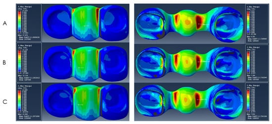 The peak stresses in models A, B, and C were observed at the superiobuccal portion of the mesial implant. Model A, with a 0.25 mm radius of gingival embrasure presented the highest peak stress value (225 MPa) among all three models. The peak stresses in model B and model C were 189 MPa and 220 MPa, respectively. The distribution of Maximum Principal Stress within the ceramic veneer and zirconia framework is shown in Figure 3. The red colors represent the higher tensile stresses and the blue colors represent the lower tensile stresses. The peak stresses within the veneers were observed at the occlusal surface of the pontic, near the loading area for all models. The veneer peak stress values were 18 MPa for model A, 15 MPa for model B, and 14 MPa for model C. The peak stresses on the gingival embrasure of the veneer were observed at the mesial connector on model A (8 MPa), and at the distal connectors on model B (7 MPa) and C (6 MPa).