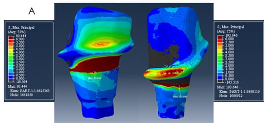 Distribution of Maximum Principal Stress on model A. The mesial abutment is on the right with a buccal view and the distal abutment on the left with a lingual view.