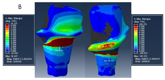 Distribution of Maximum Principal Stress on model B. The mesial abutment is on the right with a buccal view and the distal abutment on the left with a lingual view.