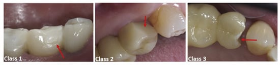 The results on models A, B, and C in this study demonstrated that the presence of peak tensile stresses near the loading area, independent of the size of the radius of curvature, could be responsible for chipping fracture, which is the most common cause of failure of multilayered FDPs [42,43,44]. It has been found that the stress values at the connector area are much lower than the flexural strength of the zirconia (800–1500 MPa) [10], indicating a low chance of failure in this area. This can be explained by the observations in two clinical follow-up studies [38,39], which analyzed a total of 88 all-ceramic implanted supported FDP with 0.25 mm, 0.50 mm, and 0.75 mm curvatures of gingival embrasure. No fractures occurred within the connector or embrasure areas. Chipping fractures occurred almost exclusively on the glass-ceramic veneers and were classified as: (1) Class 1—no intervention needed; (2) Class 2—repairs warranted and; (3) Class 3—remake of FDP required (Figure 7) [39]. In addition, no statistically significant correlation was found between the curvature of gingival embrasure and the survival probability of implant-supported FDPs with zirconia frameworks.