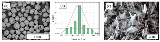 The microstructure and morphology of the cenospheres as well as polypropylene fibers used as additions into the standard Thermacoat™ mix are shown in Figure 1. The cenospheres are largely hollow with an uneven surface (Figure 1a). They range in diameter from ~70 µm to ~450 µm, with an average diameter of 230 µm (Figure 1b), which is in agreement with the literature [,]. The polypropylene fibers showed a more uniform size distribution consistent with their technical specifications, as given in the Materials and Methods Section. The stirring of the Thermacoat™ powder with water added at a ratio of 98:6 allows to obtain a slurry with fluidity optimized up to a level, which allows covering ceramic parts by immersion. It could be kept in that form also with up to 2.5 wt.% of cenospheres or 1.5 wt.% of polypropylene fibers, i.e., to keep such mixtures still in a semi-liquid /slurry type consistency (Figure 2). Above these limits, the respective mixtures turn prevailingly solid, i.e., preserve the given shape (making coatings by submersion ineffective). The elaborated limits could be easily extended by adding more water, but such a change would increase the material shrinkage and cracking during the drying stage. Additionally, it would negatively affect the overall production costs, in terms of time and energy expenditure.