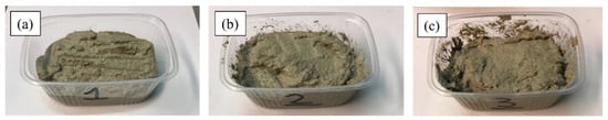 Samples of the Thermacoat™ powder mixed with water (a), with 2.5 wt.% excess addition of cenospheres (b) and 1 wt.% polypropylene fibers (c).