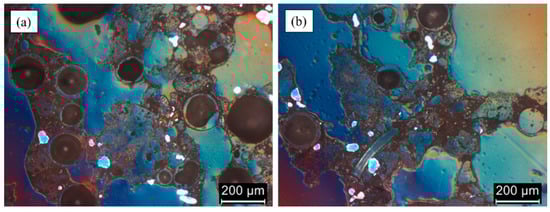 The microstructure characterization using light microscopy (LM) of the investigated mixtures, due to their high brittleness in a dry state, was performed by crushing them into small pieces and then stabilizing with a polymeric resin. Only then it was possible to produce their sections suitable for polishing and subsequent LM observations. The polymeric resin can be easily distinguished from the solidified chunks of the investigated materials at LM images (Figure 3a,b) due to their bluish color. The performed observations confirmed that both the cenospheres and polypropylene fibers were well dispersed within the plain cement-type powders of the Thermacoat™ (Figure 3a,b).