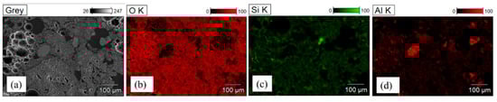 The SEM secondary electron (SE) observations coupled with the EDS analysis of the local chemical composition confirm that the major components of the Thermacoat™ are silicon and oxygen (Figure 4). Figure 4 presents an area chosen for analysis together with the corresponding elemental distribution maps. The evident separation of these elements confirms that the respective areas correspond to SiO2- and Al2O3-rich components. Additionally, the presence of aluminum particles of the size of ca. 100 μm was confirmed (in the LM images, they were visible as white/magenta particles). Simultaneously, these observations showed that some cenospheres are punctured and in consequence filled with particles of the Thermacoat™ powders (Figure 5). The cenosphere walls are built mainly of silicon oxide, but minor amounts of Mg, K, Ca and Na were also detected.
