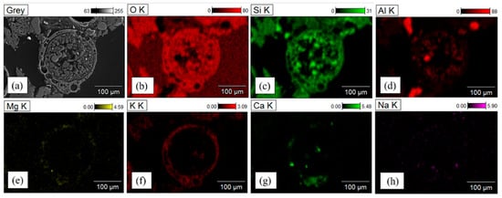 SEM/BSE image (a) of cenospheres in the Thermacoat™ and accompanying maps representing the distribution of O (b), Si (c), Al (d), Mg (e), K (f), Ca (g), and Na (h); the latter are the main constituents of cenospheres.