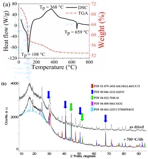 TGA and DSC curves representing weight loss and heat flow during the heating of plain Thermacoat™ (a). XRD spectra of this material in both as-dried condition 200 °C/2 h and after additional heat treatment at 700 °C/4 h (b). Green and blue arrows denote the position of lines corresponding to the α-Al and Al2O3 phases, respectively.