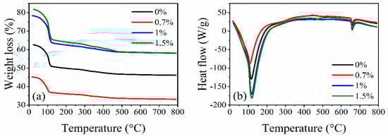 TGA (a) and DSC (b) curves representing weight loss and heat flow during the heating of the Thermacoat™ with up to 1.5% addition of polypropylene fibers.