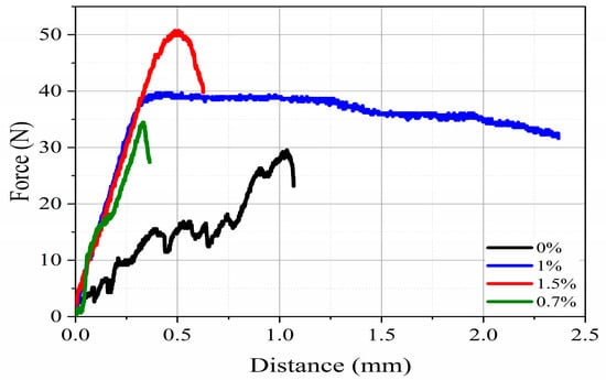 Curves presenting resistance force (N) versus travers of the anvil representative for the Thermacoat™ with 0%, 0.7%, 1% and 1.5% addition of polypropylene fibers.