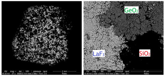 Based on the EDX measurements presented in Table 3 and comparing the theoretical values expected for each pure compound, the black area in the image taken by backscattered electrons (Figure 1) mainly corresponds to silica, the dark gray mainly corresponds to germanium dioxide, and the light gray mainly corresponds to lanthanum trifluoride. None of these three zones corresponds to a pure compound, and each shows the presence in a smaller quantity of the phases other than the majority.