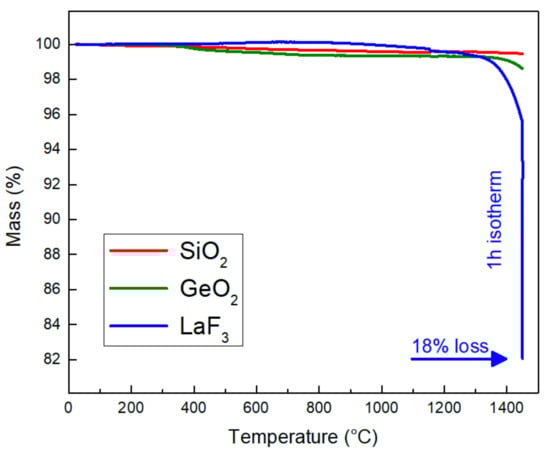 We started by studying with TGA the mass losses of each compound (SiO2, GeO2, LaF3). Figure 2 shows the losses measured as a function of temperature.