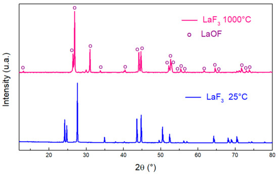 After thermal treatment of LaF3, the XRD pattern gives important information by informing us about the final product obtained. To follow the evolution of the structure as a function of the temperature, a heat treatment at 1000 °C was applied in a furnace. A LaOF formation around 1000 °C is confirmed by comparing the patterns of our heated sample with that of the literature [21,23] with an almost perfect match (Figure 3). EDX results support the production of this product with average atomic percentages of 34.1, 33.2 and 32.7% of lanthanum, oxygen and fluorine, respectively. Theoretically, these values are equal to 33.33% for each element.
